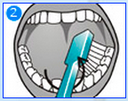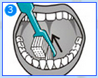 3.Cepille la parte interior de sus dientes posteriores colocando las cerdas en un ángulo de 45 grados con respecto a sus encías. Efectúe movimientos cortos de atrás hacia adelante.