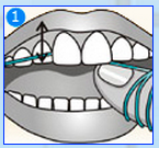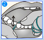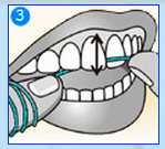 2.Tensar un trozo de unos 2 a 3 cm. de hilo dental utilizando los dedos pulgares y los índices. Introducir el hilo entre los dientes con un suave movimiento de sierra. Cuando el hilo dental llegue al borde de las encías, cúrvelo en forma de C contra uno de los dientes y deslícelo suavemente en el espacio entre la encía y el diente hasta que se note resistencia. Nunca lo aplique violentamente contra las encías.